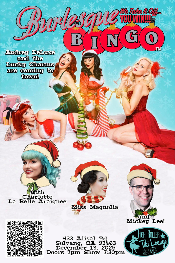 Now, she and her Lucky Charms are taking over Solvang one bingo card at a time!This raucous burlesque game show returns to The High Roller Tiki Lounge on Saturday, December 13, 2025. Enjoy the Girls-Games-Fun-Prizes in an up-close and intimate setting! This is an interactive experience for people who love FUN!
